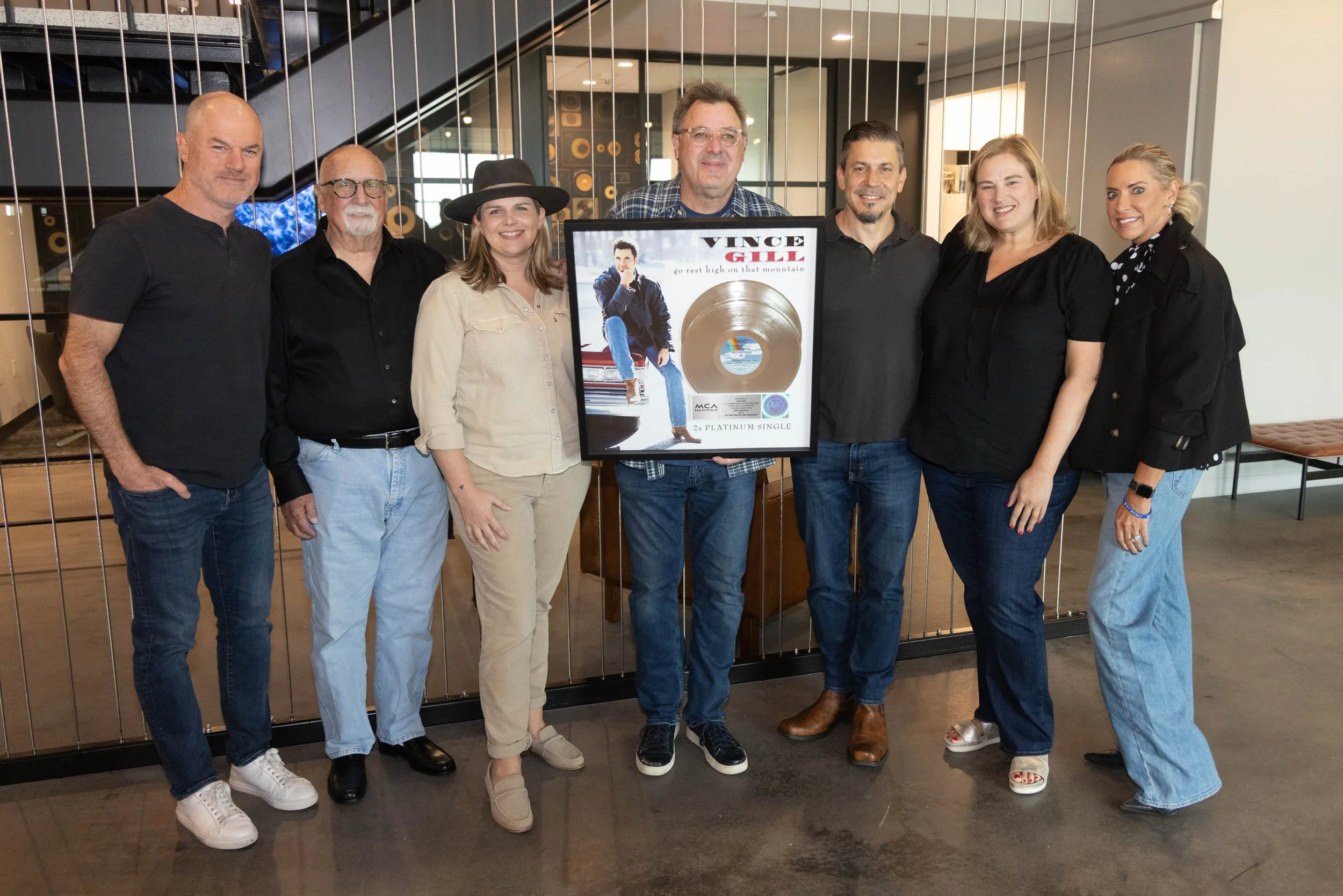 L-R: MCA’s Mike Harris, Larry Fitzgerald (Hey Buddy Entertainment), Katie McCartney (MCA), Vince Gill, Rob Femia (MCA), Jackie Jones (RIAA), and Stephanie Wright (MCA)